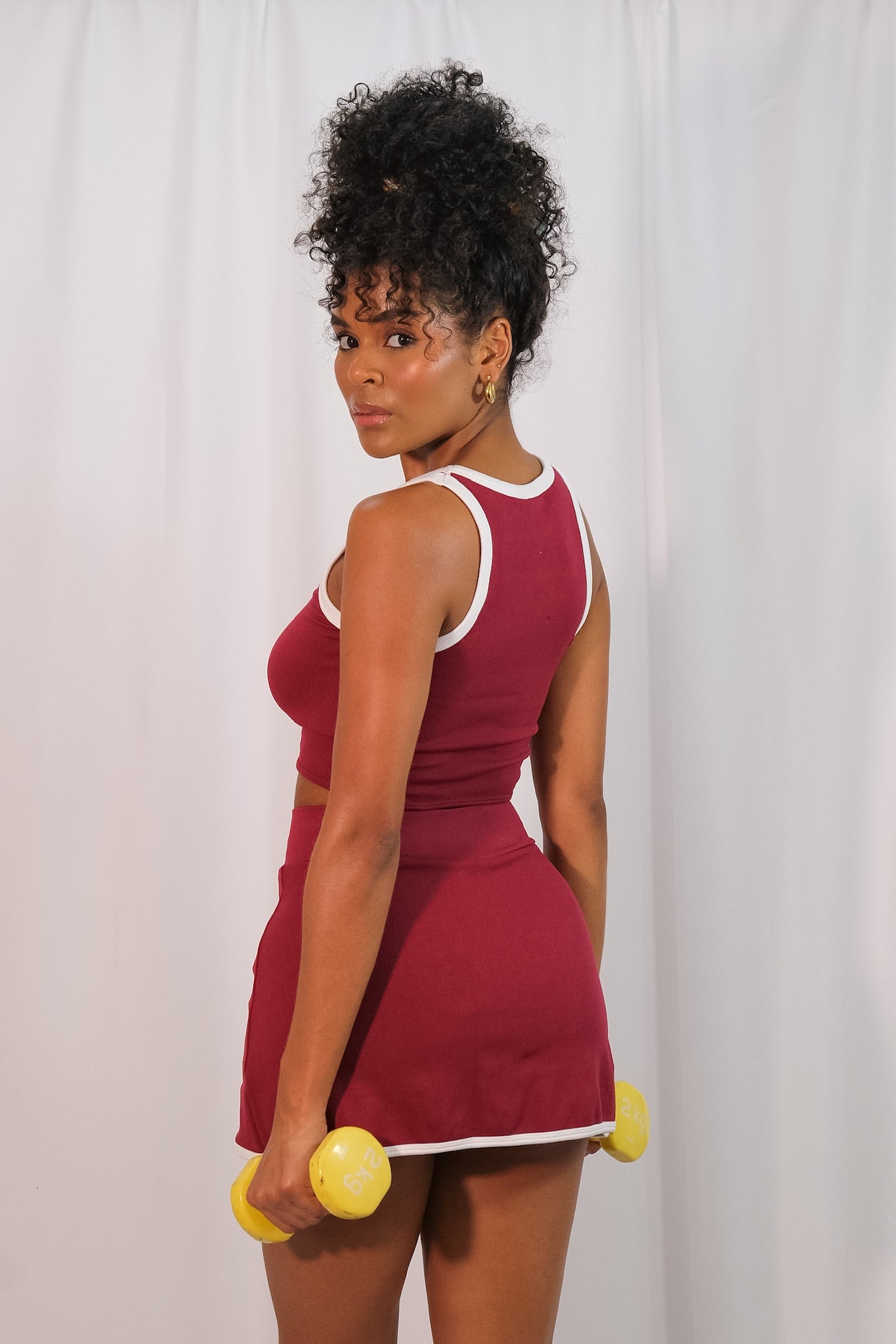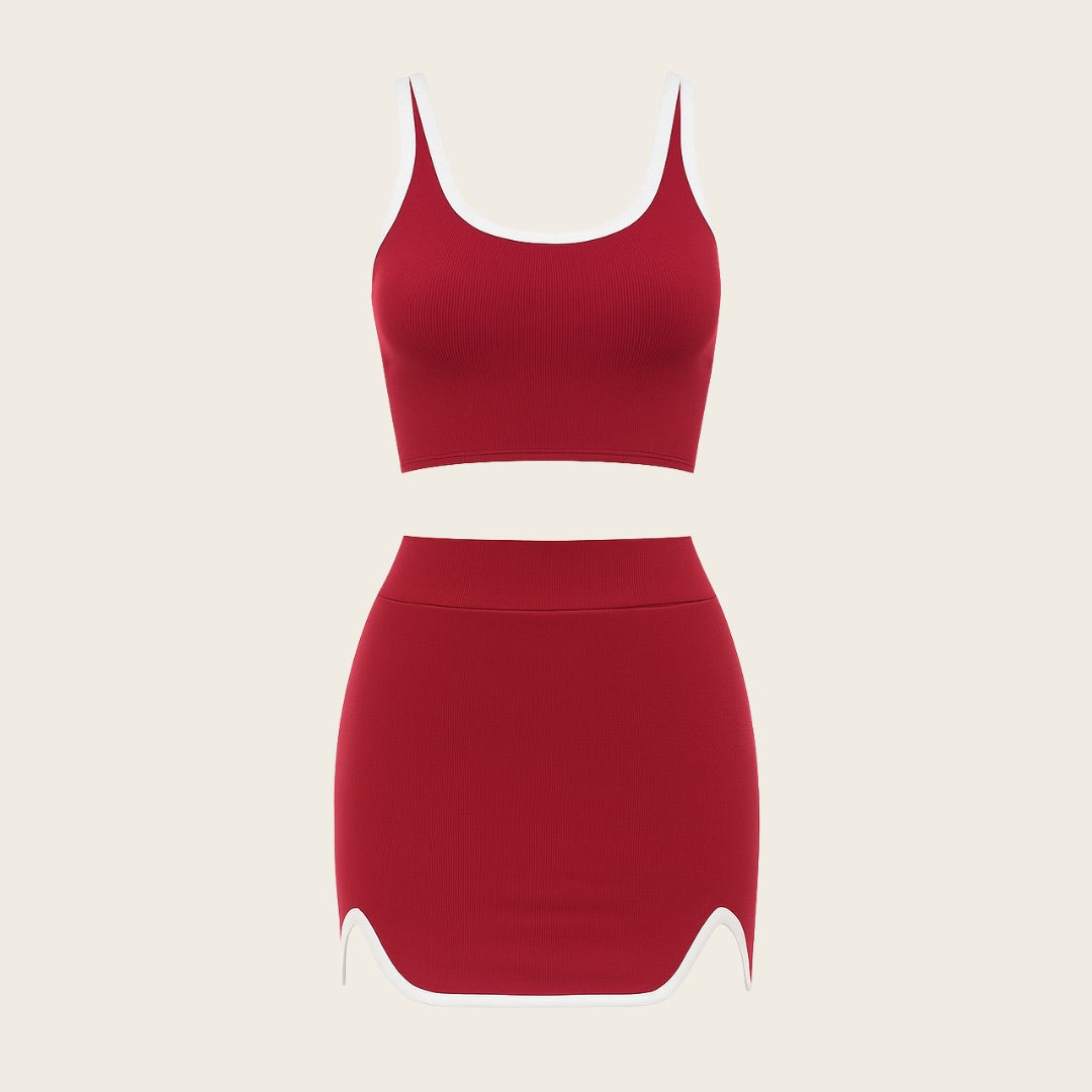 Eleva tu estilo con este conjunto de dos piezas que combina un crop top y una falda ajustada. Confeccionado en tela acanalada suave y elástica, ofrece un fit favorecedor que realza tu figura sin perder comodidad.